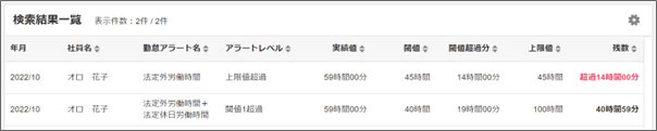 勤務時間や残業時間の実績集計に加え、月45時間の残業時間を超過した回数などのカウント、上限に対する現在の数値に応じたアラート機能が追加されたことで、36協定を含めた労働法規をより遵守しやすくなりました。