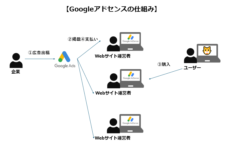 ⑥Google:webサイト管理者(あなた)に報酬を支払う