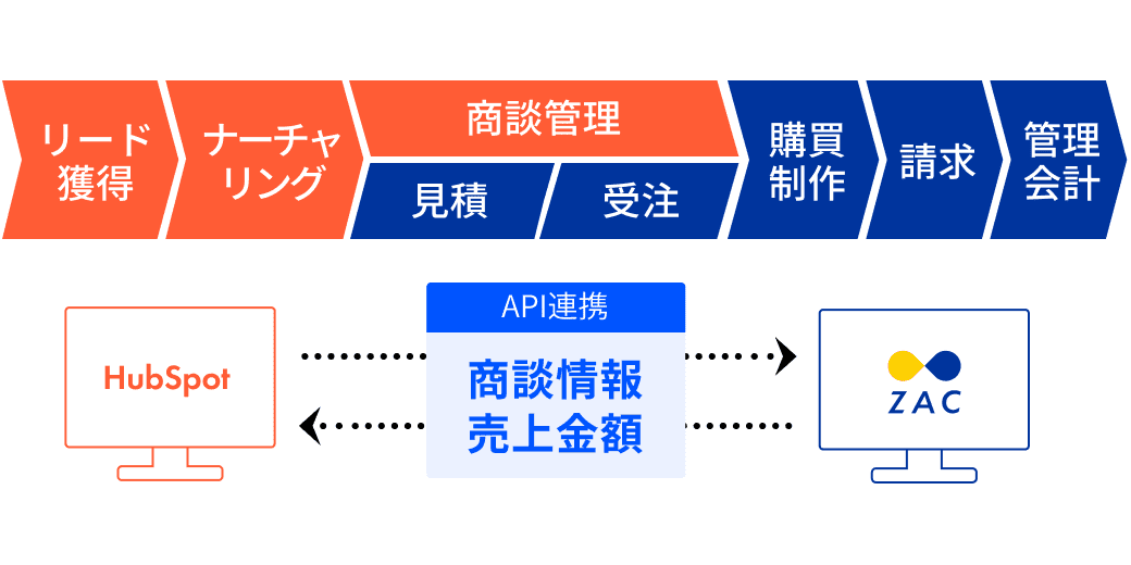 詳細な営業活動情報を管理するHubSpotと、 請求・売上・発注など経理・経営につながる情報を管理するZACが連携されることで、一気通貫した業務管理を実現。一連の業務データが分断されることなく、部門間での同一情報・数字の共有を可能にします。営業と管理部門で把握している売上金額が異なったり、日付情報が間違っていたりといった不備やトラブルが無くなります。タイムリーで正確なデータがZACに反映されるため、精緻なフォーキャスト分析も実現。現場の効率化に留まらず、最適な経営判断にも役立ちます。