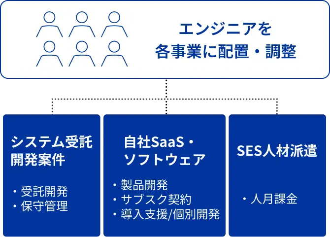 IT業界は受託開発や保守管理、SaaS・ソフトウェアのプロダクト開発と提供、SES・人材派遣など、エンジニアを中心にした複数事業を展開します。